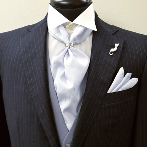 どうしても同じようなスーツスタイルになってしまいがちですが、ネクタイを『アスコットタイ』に変えるだけでも印象が変わります。