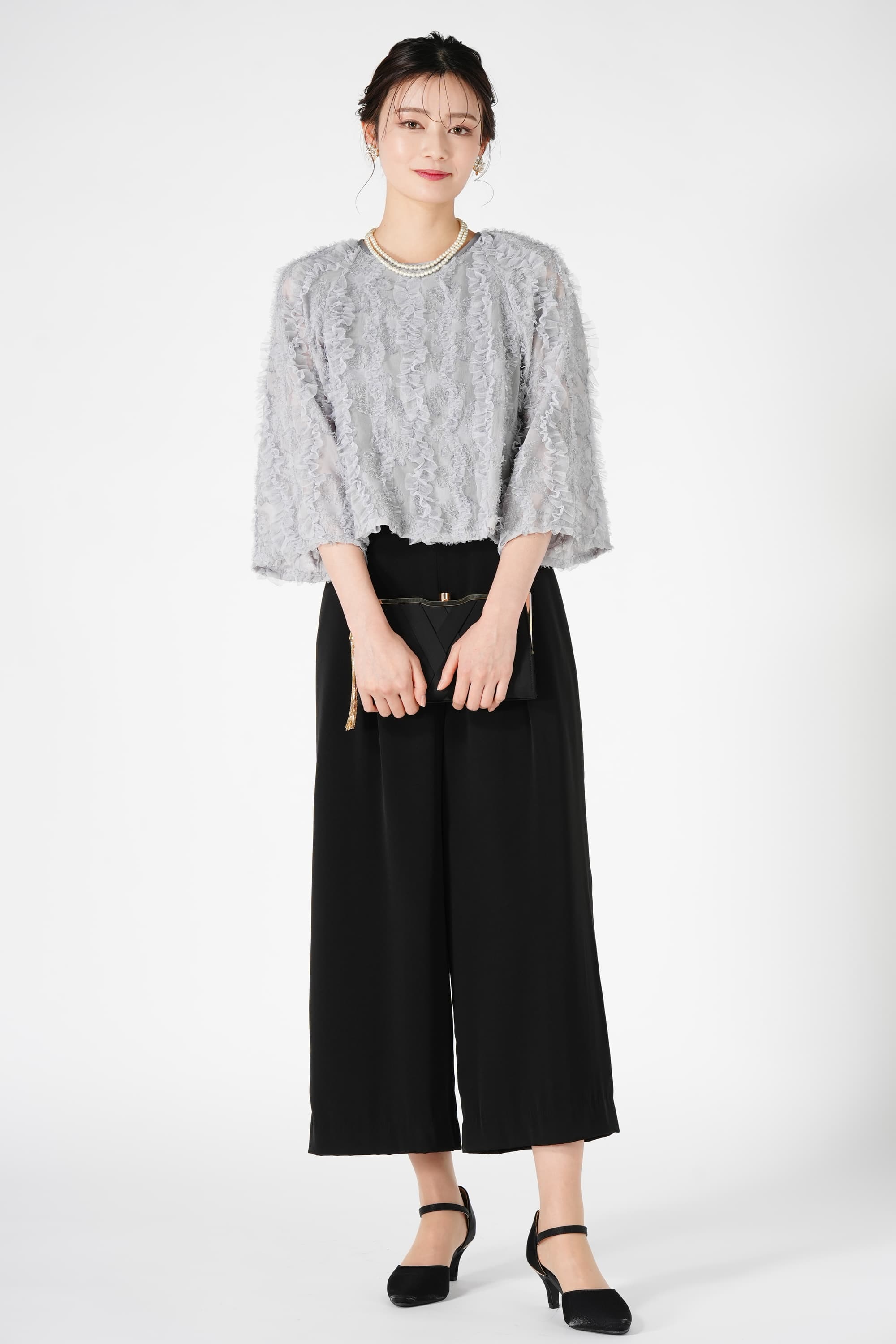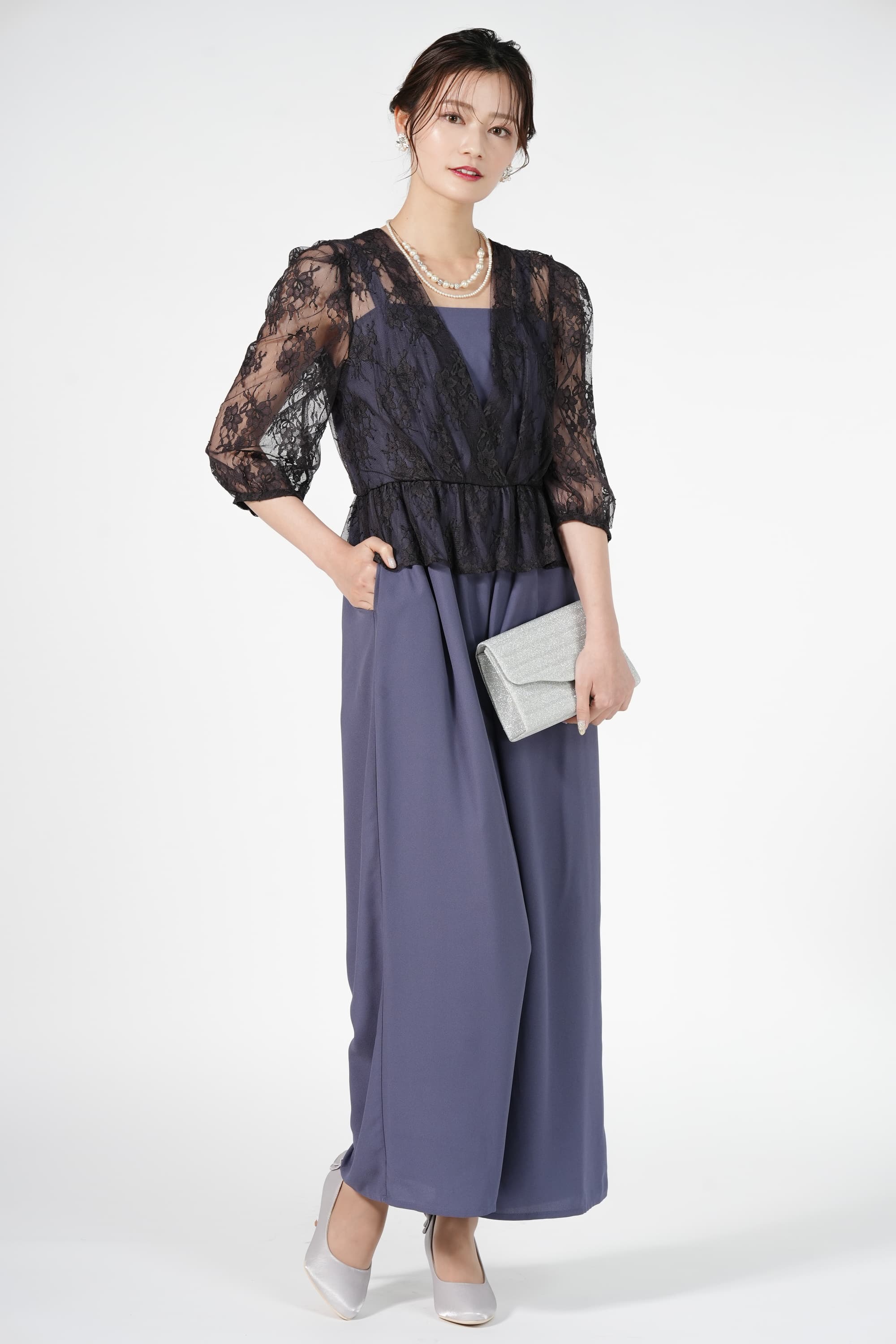 黒のブラウス風レース&ダルブルーのバイカラーパンツドレス。