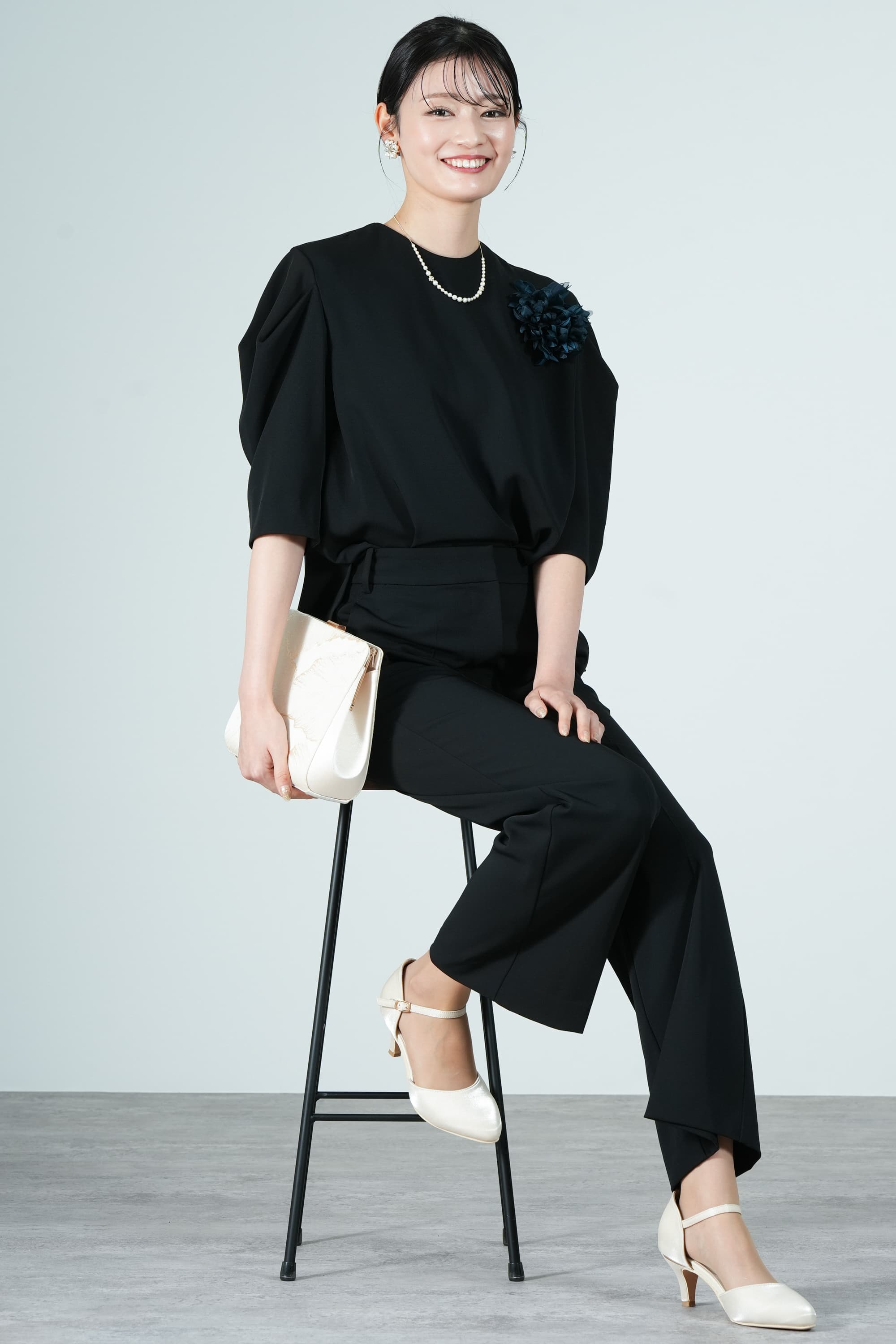 人気&定番色である『ブラック』のパンツドレスは、大人の女性にピッタリのスタイル。