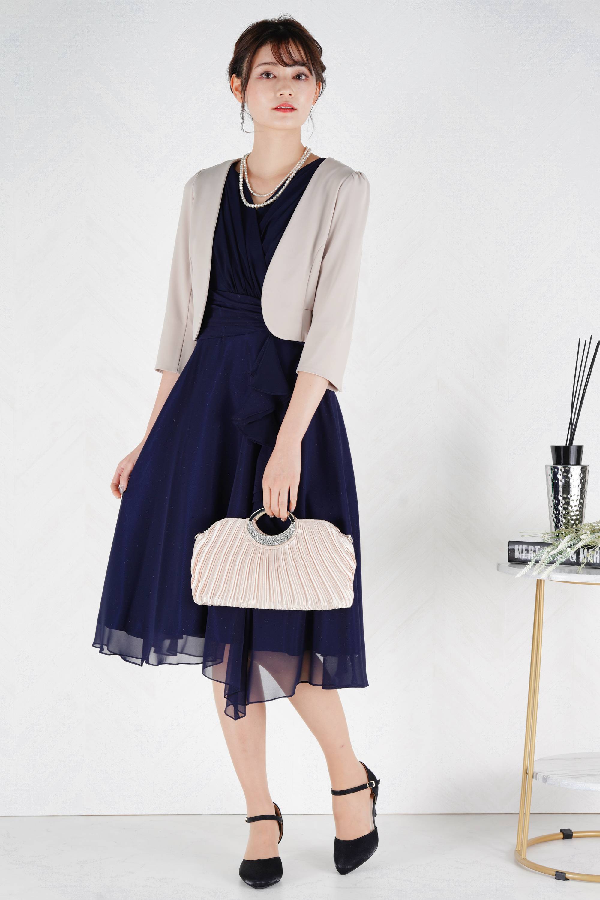 王道のネイビードレス&シャンパンカラーショールのコーディネート。