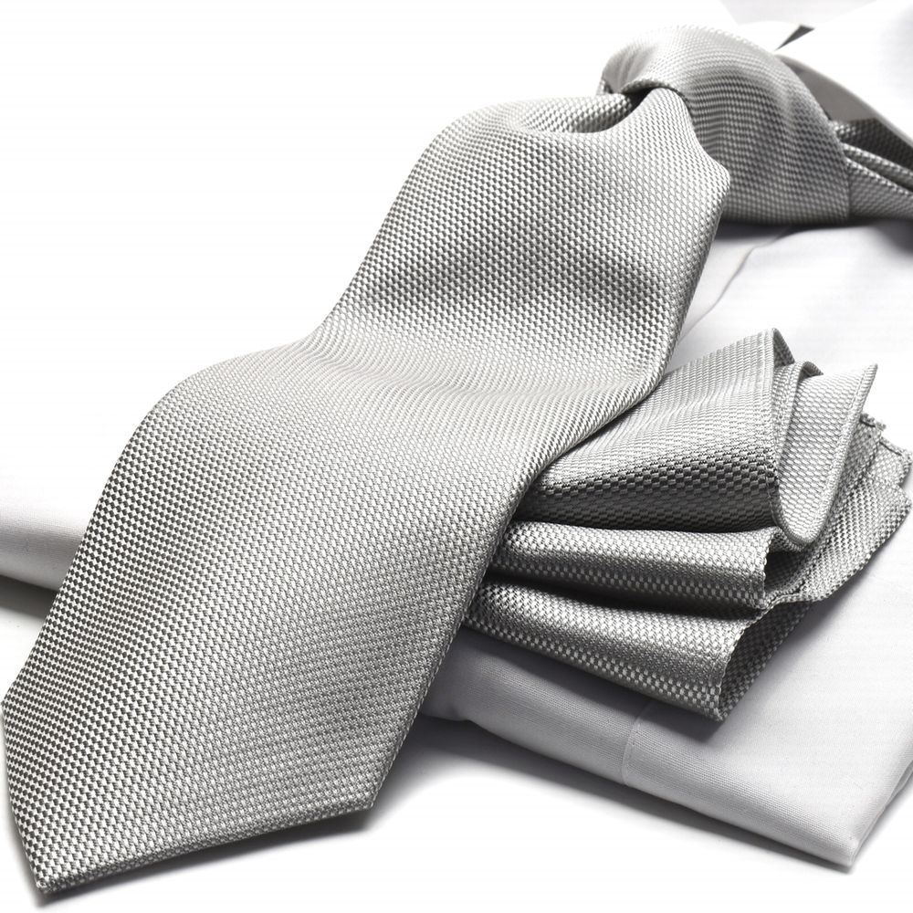 画像:織柄のシルバーネクタイ&ポケットチーフセット