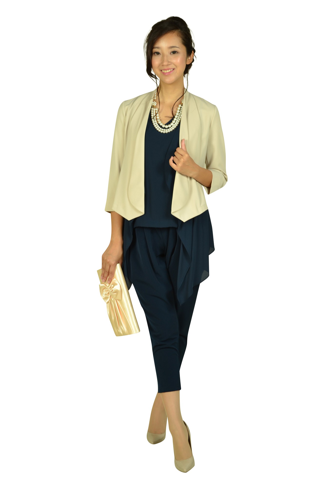 フロントのフリルがエレガントなネイビーのパンツドレス。